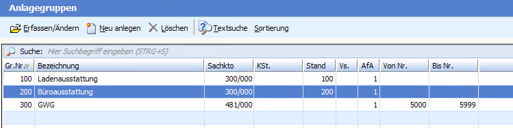 Darüber hinaus ist die Zuordnung von einzelnen Anlagegütern zu einer Gruppe sinnvoll, um die Verbuchung gleicher Abschreibungsarten auf unterschiedliche Sachkonten zu gewährleisten.