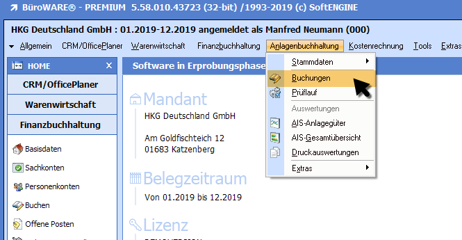 Wirtschaftsgüter erfassen Sie über den Menüpunkt "Buchungen".