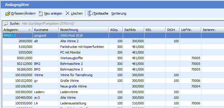 Mit der Taste [F3] oder dem Button "Neu anlegen" können Sie nun ein neues Wirtschaftsgut anlegen.