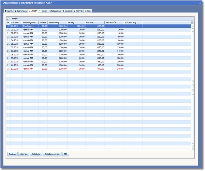 In dieser Spalte ersehen Sie den pro Monat ermittelten Restbuchwert des Anlagegutes.