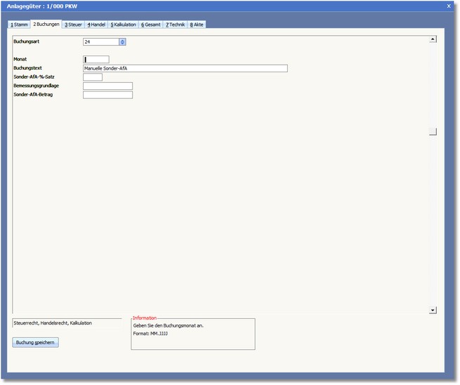 Eingetragen wird der Monat und das Jahr der Sonderabschreibung. Der Abschreibungsbetrag wird nur in dem hier angegebenen Monat/Jahr gebucht. Die Form ist [MM.JJJJ].
