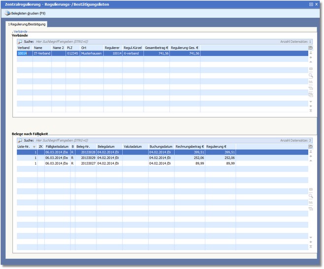 Navigation:  Finanzbuchhaltung > Laufende Vorgänge > OP-Verwaltung > OP-Zentralregulierung > OP-Zentralregulierung - Beleglisten >