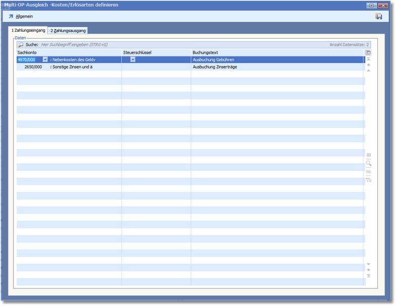 Hier können Sie für den Zahlungsein- und -ausgang Kosten-/Erlösarten definieren, die in der Multi-OP-Tabelle (bei Sammelzahlung) automatisch angezeigt werden.