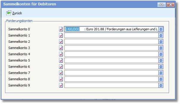 Über den Menüpunkt "Bearbeiten > Sammelkonten für Debitoren" in den Basisdaten werden die Sammelkonten für Forderungen festgelegt. Die gesamten offenen Beträge der Kunden werden automatisch auf diesem Forderungskonto gesammelt. Es können 10 Sammelkonten eingetragen werden, auf welche die Salden der Debitoren für das Hauptbuch kumuliert werden.