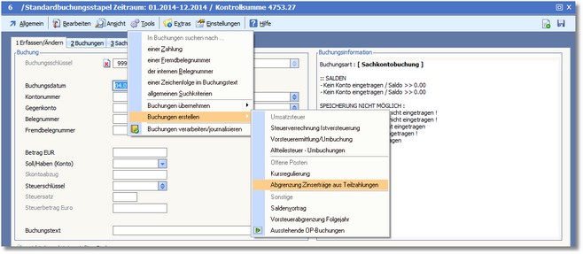3. Wählen Sie in der Buchungsmaske den Menüpunkt "Tools > Buchungen erstellen > Abgrenzung Zinserträge aus Teilzahlungen".