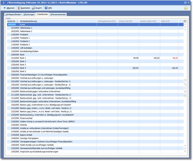 Zunächst erhalten Sie in der vorgelagerten Auswahltabelle eine Übersicht über die vorhandenen Sachkonten mit den aktuellen Salden in Euro angezeigt.