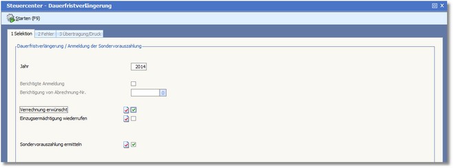 Der Dialog zur Erstellung der Dauerfristverlängerung wird zunächst mit der Karteikarte "Selektion" geöffnet.