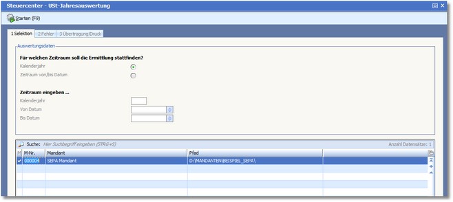 Der Dialog zur Erstellung der Umsatzsteuer-Jahresauswertung wird zunächst mit der Karteikarte "Selektion" geöffnet.