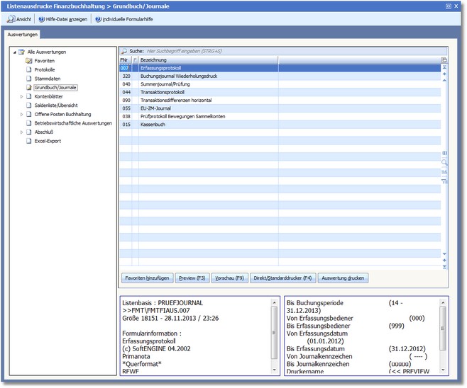 Diese Liste wird im allgemeinen auch als Buchungsprotokoll oder Primanota bezeichnet. Es dokumentiert die Buchungen nach der Reihenfolge der Eingabe (Zeitprotokoll) und nach dem Erfassungsbediener. Dieses Protokoll hat handelsrechtliche Bedeutung im Hinblick auf den § 239 Abs. 2 HGB. Es kann nur für noch nicht endgültig verarbeitete (versiegelte) Buchungen ausgegeben werden.