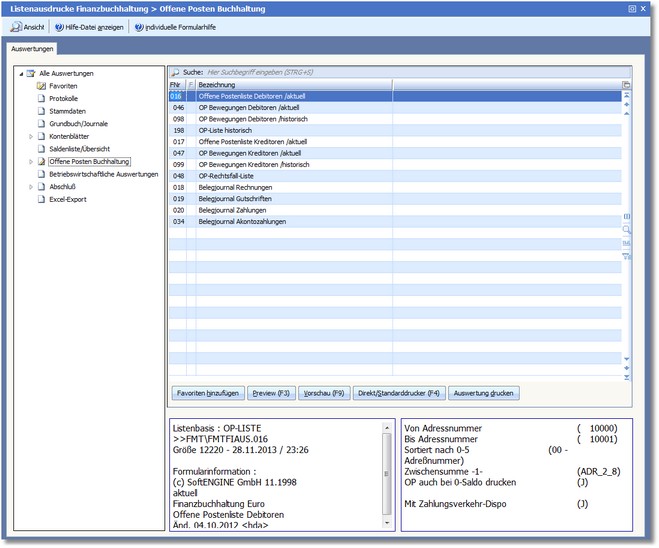 Hier können Sie die Offene-Posten-Buchhaltung über verschiedene Listen auswerten.