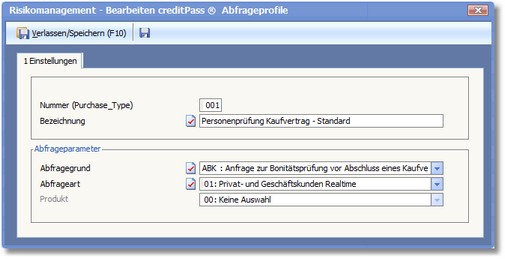 Für das Profil (Purchase_Type) "001" könnte z.B. eine Schufa-Auskunft, eine Adressprüfung bei der Post und eine Negativlistenauskunft laufen. Für das Profil "003" z.B. könnte Schufa, Negativliste und zusätzlich Bürgel oder Terrorliste bei creditPass® laufen.