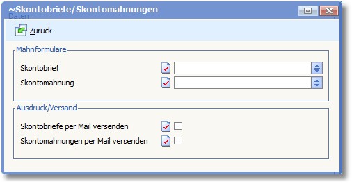 Hinterlegen Sie hier Ihre Formularnummer für die Erstellung von Skontobriefen. Dazu können Sie mit der Funktionstaste [F5] aus der Auswahl Mahnungen das entsprechende Formular auswählen und mit [RETURN] in das Feld übernehmen.