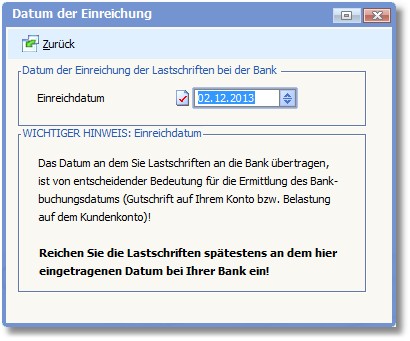 Tragen Sie hier das Datum ein, an dem Schecks bzw. Lastschriften an die Bank übertragen werden. Es wird vom Programm automatisch das Tagesdatum vorgeschlagen. Mit [F5] können Sie hier den Kalender öffnen, um einen anderen Tag auszuwählen.