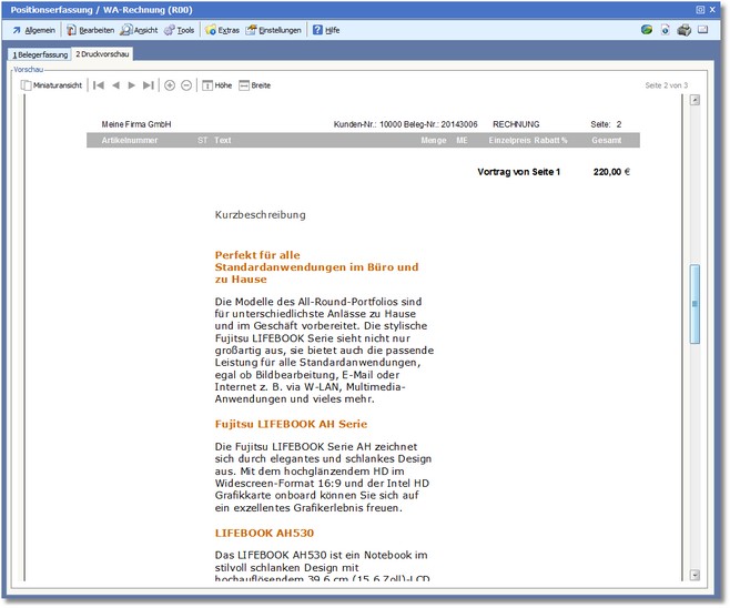 Das Standardbelegformular bietet auch die Möglichkeit, RTF-Texte mit Formatierung auszudrucken, bspw. eine RTF-formatierte Positionsnotiz mit Farben und fetter Schrift.