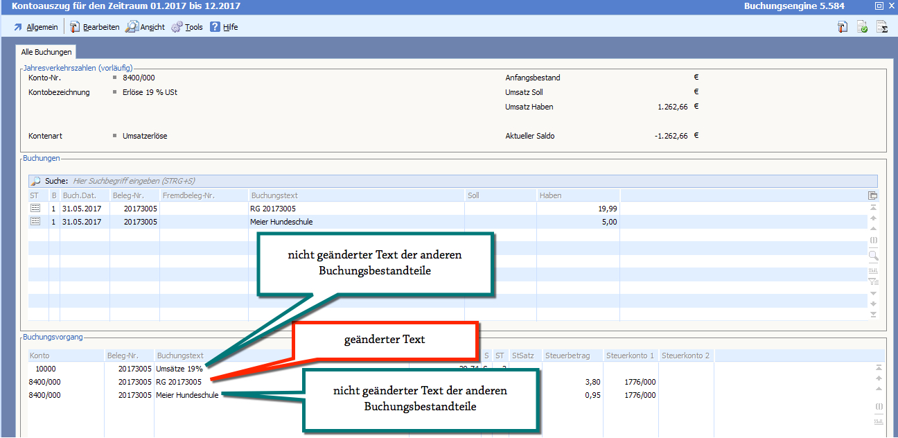 Häufig besteht die Notwendigkeit einen Buchungstext zu ändern. In Versionen vor 5.58 war das nur dadurch möglich, dass die Buchung geöffnet, geändert und neu verbucht wurde. Das war einerseits aufwendig, andererseits konnte das zu Fehlern führen.