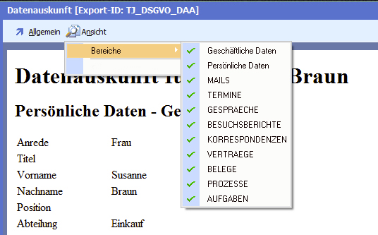 Über das Menü „Allgemein ➜ Drucken“ kann die Datenauskunft an einen Drucker übergeben und beispielsweise mittels des PDF-Mailers in eine PDF-Datei gewandelt und versandt werden.