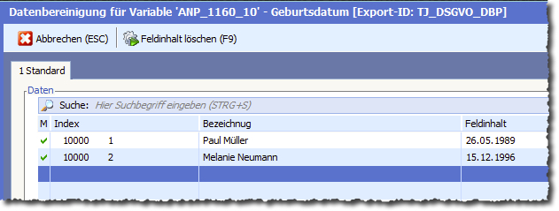 Durch Klick auf die Schaltfläche „Feldinhalt Löschen“ werden die Feldinhalte für das aktuell angezeigte Feld (im Beispiel Geburtsdatum) in allen markierten Datensätzen gelöscht.