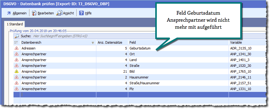 Beim Start dieser Funktion werden die als hinsichtlich der DSGVO kritisch bewerteten Felder auf Inhalt geprüft.
