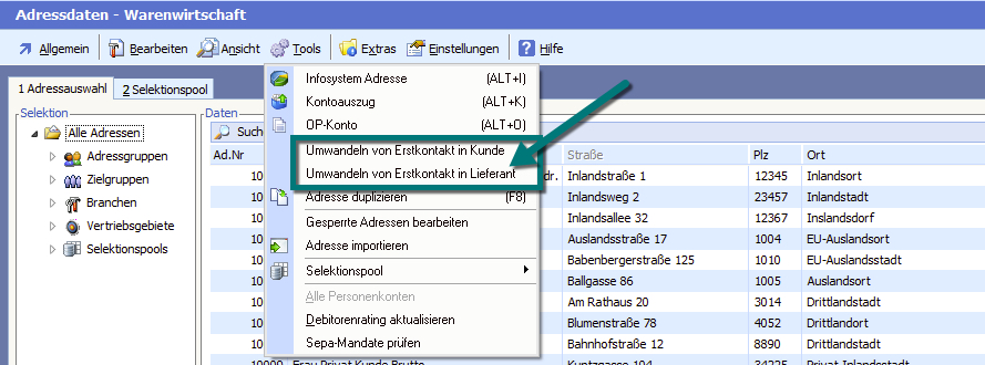 Erstkontakte können über eine Menüfunktion in einen Kunden oder Lieferanten gewandelt werden.