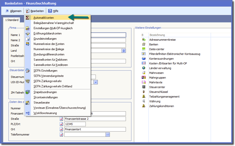 Die Konteneinstellungen befinden sich in den Basisdaten im Menü "Bearbeiten ➔ Automatikkonten"