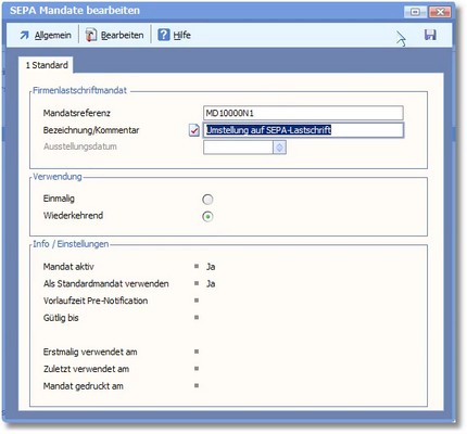 Für alle Kunden, mit denen Lastschriftvereinbarungen bestanden, werden vom Programm automatisch Mandatsnummern erstellt, welche Sie jedoch mit einem Klick auf den entsprechenden Datensatz bei Bedarf verändern können.