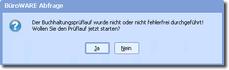 Sollte der Prüflauf nicht innerhalb des eingestellten Zeitintervalls (Designer: Zugriffsrechte) ausgeführt worden sein, erhalten Sie eine Meldung, dass der Prüflauf gestartet werden muss. Ohne Prüflauf ist keine Buchung möglich.