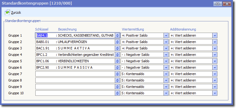 Jedes Sachkonto benötigt Einstellungen, die festlegen, wo das Konto in den Auswertungen (Bilanz, GUV usw.) aufgeführt wird.