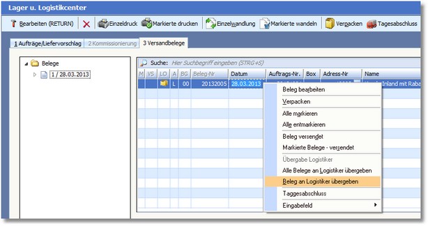 Nachdem die Positionen des Beleges verpackt wurden, kann über das Kontextmenü die Übergabe an den/die Logistiker durchgeführt werden:
