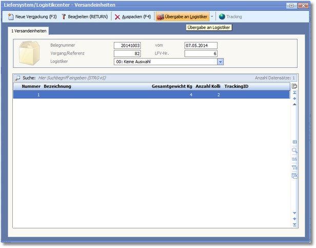 Wird der Beleg direkt über die Belegtabelle (ohne Liefersystem) verpackt, kann, nachdem die Positionen verpackt wurden, im Versandeinheiten Dialog die Übergabe an den entsprechenden Logistiker durchgeführt werden.