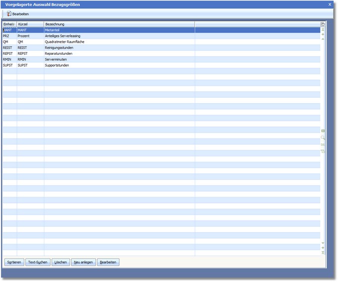 Das Programm öffnet die vorgelagerte Auswahltabelle der Bezugsgrößen.