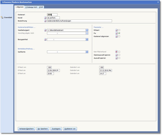 Diese Karteikarte nimmt die allgemeinen Daten zur Kostenart auf.