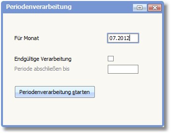 Klicken Sie mit der Maus auf den Button <Periodenverarbeitung starten> um den Vorgang zu starten. Klicken Sie auf den Button <Verlassen> um das Fenster zu schließen, ohne die Periode zu verarbeiten.