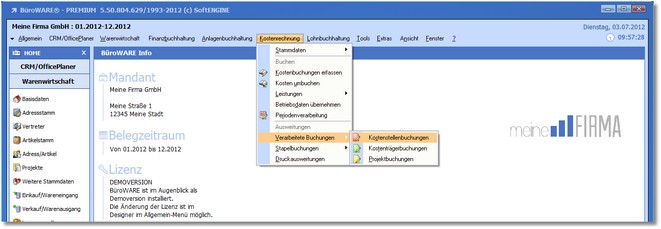 1. Klicken Sie mit der Maus im Hauptmenü auf "Kostenrechnung > Auswertungen > Projektbuchungen".
