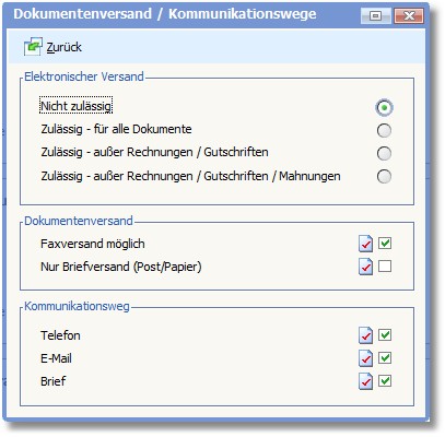 Legen Sie hier die Parameter für Dokumentenversand und Kommunikation mit der Adresse fest: