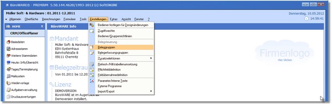 2. Klicken Sie mit der Maus im Hauptmenü auf "Einstellungen" und dann auf "Beleggruppen".