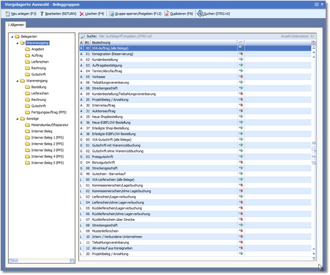 Das Programm öffnet die vorgelagerte Auswahl der Beleggruppen.