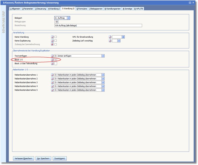 6. Tragen Sie im Feld BLOCK 1-5 die Ziffer des 5-zeiligen Übernahmeblocks ein, der auf diesem Beleg erscheinen soll, wenn ein anderer Beleg in diesen Beleg gewandelt wird.