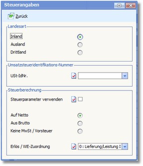 Die Steuerberechnungsart ist von besonderer Bedeutung. Über einen Radiobutton wird gesteuert, ob die Positionen Netto, Brutto oder ohne Umsatzsteuer ausgewiesen werden. Weiterhin wird über die Steuerberechnungsart die inländische Transaktionswährung (Belegwährung) des Kunden/Lieferanten bestimmt.
