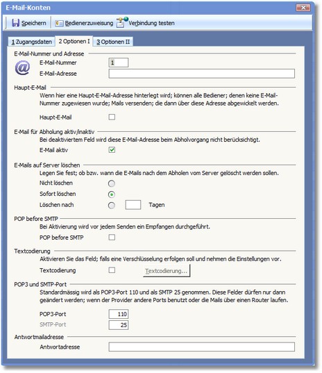 << Hier KLicken um eine Inhaltsübersicht anzuzeigen >> Navigation: CRM/OfficePlaner > Mailsystem > Mail einrichten > E-Mail-Assistent - Extras > E-Mail-Konten > Neues E-Mail-Konto > Die Karteikarte "Optionen I" |