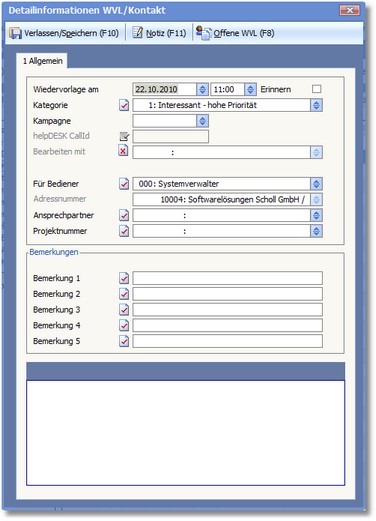 Eingetragen bzw. angezeigt wird der Bediener, der den Kontakt zum Wiedervorlagezeitpunkt bearbeiten soll.