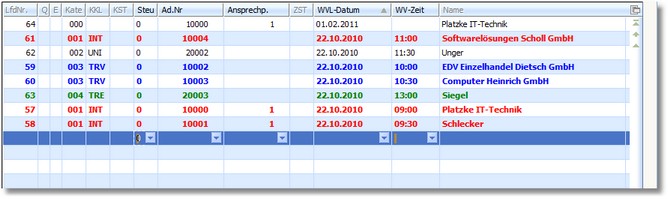Hier können Sie die Uhrzeit eintragen, wann der Kontakt bearbeitet werden soll (z.B. Anruf um ...). [F5] öffnet hier die Auswahltabelle der Ansprechpartnerzeiten, die in den Adressstammdaten hinterlegt werden müssen.