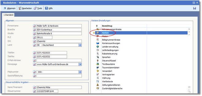 "Banken" dient zur Erfassung der unternehmenseigenen Bankverbindungen. Für jede der 99 möglichen Bankverbindungen können umfassende Informationen hinterlegt werden. Angaben über die vereinbarte Kreditlinie für das Cash-Management im Rechnungswesen oder der für internationale Transaktionen notwendige Swiftcode sind ebenfalls Bestandteil dieses Moduls.