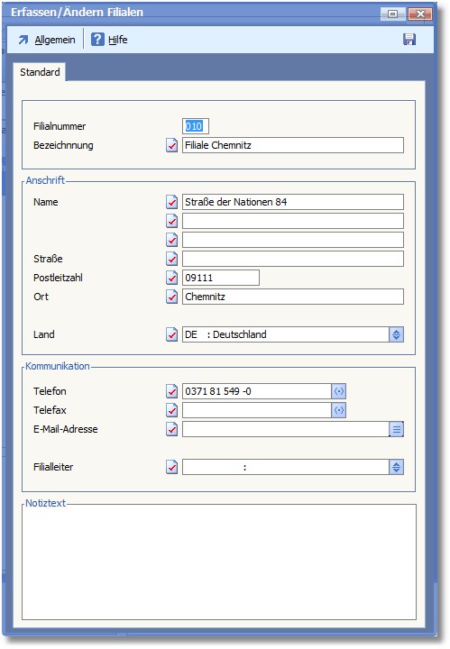 Hier werden allgemeine Daten zur Filiale hinterlegt: