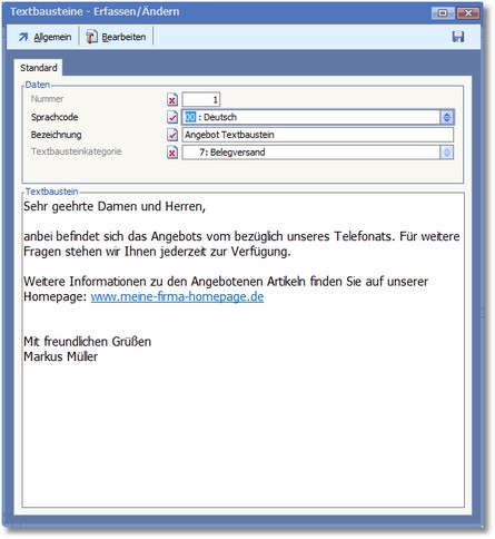 3. Hier können Sie im Bereich "Textbaustein" nun einen Text nach Ihren Wünschen erfassen.