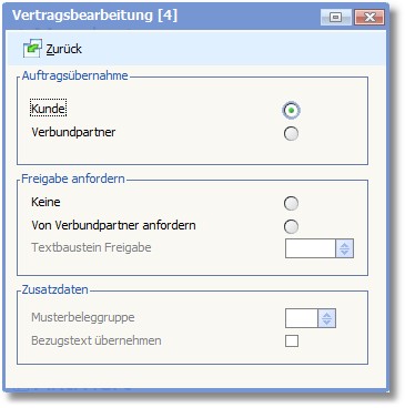 Bei bestimmten Vertragstypen (z.Zt. Wartung und Miete) können Sie Berechnung des Vertrages von der Freigabe des Verbundpartners abhängig machen. In diesem Fall können Sie eine Freigabe vom Verbundpartner per E-Mail anfordern. Legen Sie dies hier durch Aktivierung des entsprechenden Radiobuttons fest.