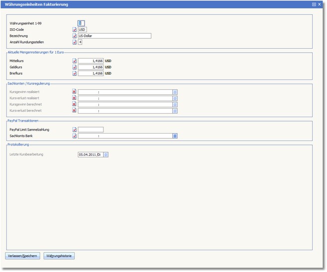 Mit [F10] werden Ihre Eingaben gespeichert, der Dialog wird geschlossen und Sie kehren zur vorgelagerten Auswahltabelle der Währungen zurück.