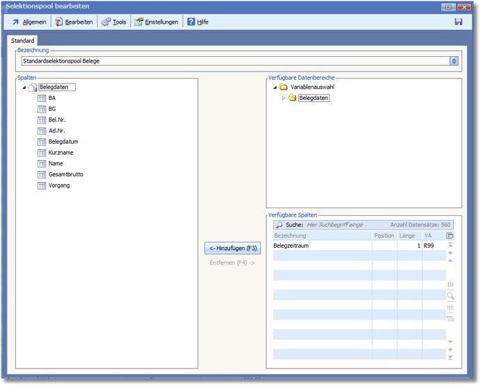 Der Selektionspool der Belegbearbeitung ist ein Sammelzentrum mit zusätzlichen Funktionen. Der Benutzer kann bspw. die im Selektionspool befindlichen Belege sortieren, gruppieren, Summen bilden oder Sammelbelege erstellen.