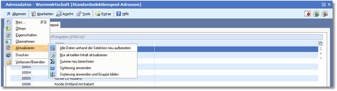 Die Aktualisierung eines Selektionspools erfolgt in der Karteikarte "Seleketionspool" über den Menüeintrag "Allgemein > Aktualisieren"
