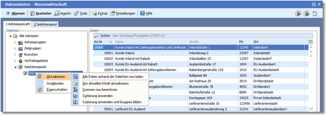 oder in den Stammdaten über das Kontextmenü der rechten Maustaste auf dem jeweiligen Selektionspool im Verzeichnisbaum.