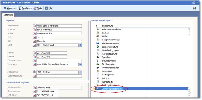 Ansprechpartner können Zuständigkeitsbereichen zugeordnet werden. Zuständigkeitsbereiche können Sie wie folgt definieren:
